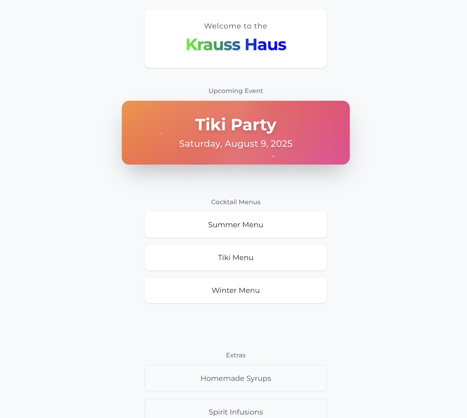 The Krauss Haus is a server-side rendered web application built with SvelteKit and TailwindCSS, that shows off our house bar menus, as well as all of our cocktail-related recipes. Check out the GitHub repo for it!